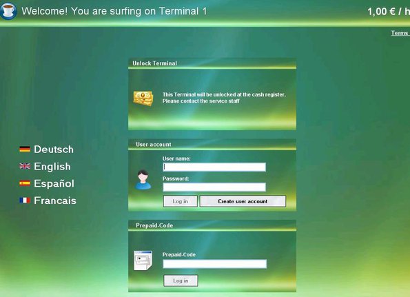 Client computers will initially see this login/registration page, where guests of your internet cafe can create accounts and login. Accounts are important, because with them you control how much credit (meaning money) the guest has spent.