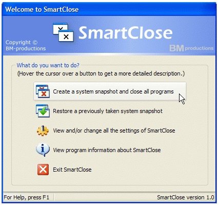 - With SmartClose, you can close all your programs smartly! Before closing the programs, they save the settings of the program so whenever you will restore them, you will get all your unsaved settings back.