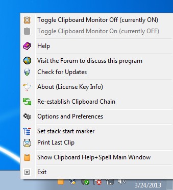 Right click on the system tray icon will allow you to turn on and off the clipboard monitor, access options and so on.