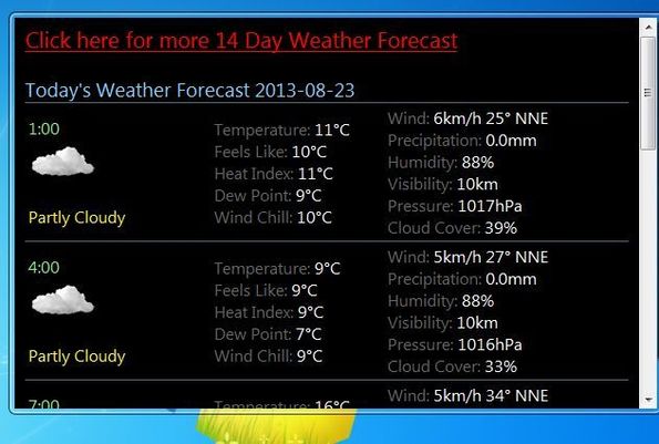 Weather Meter is a free weather forecast widget for Windows which reports detailed information about weather conditions for pretty much every location in the world. Widget reports back the usual information like the temperature, humidity, pressure, wind, cloud cover, etc. It can also give you a detailed weather forecast for the day, and additionally a 14 day weather forecast which opens up inside a web browser.