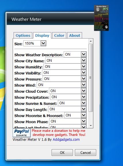 Appearance of this free weather forecast widget is slick and easy going. All the info about the weather conditions is listed in clear font, with every section having a different color (sunsets, sunrises, temperatures, etc). All the colors can be changed, and you can also select which info about the weather is gonna be shown by opening up the settings.