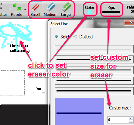 On its interface, you can add a multipage or single page PDF file using Open PDF button. After adding PDF file, use eraser (small, medium, or large) and you can start erasing unwanted contents of input PDF file. By default, eraser color will remain White. But, you can set any color and can even set custom size for eraser using buttons present at top right side on its interface. To match eraser color with background, colorful eraser is quite useful.