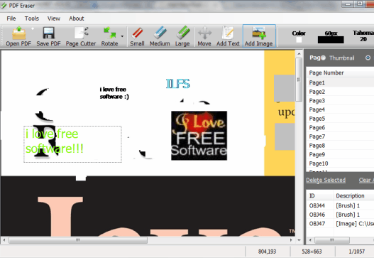 PDF Eraser is a free software to edit a PDF document by erasing text, images, and other items (including background color) in that PDF. You can erase unwanted contents and can fill erased area by adding your own text with favorite color and images. To erase PDF content, it provides an eraser whose color and size can be adjusted easily.