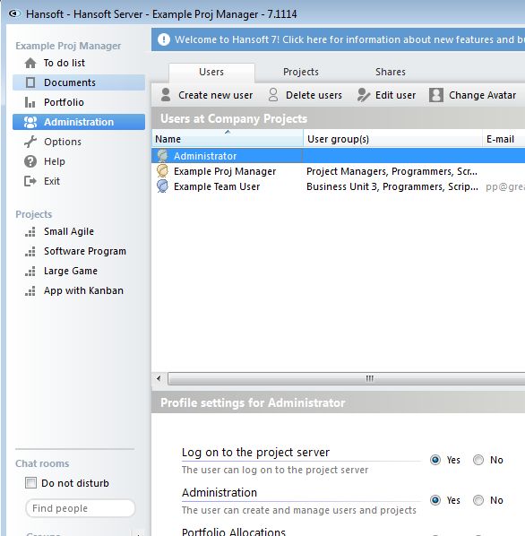 First thing after logging into Hansoft would be to tweak users who are gonna be accessing your project. You can do that by opening up Administration from the left sidebar, see image above.
