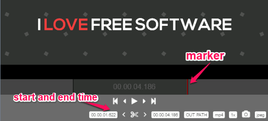 When you have imported a video to this software, you will be able to play it using the playback control at the bottom of the interface. Now, to trim any specific part of the video, the first thing you would need to do is select the start and end time. To do this, simply click on the timeline where you want to set the start time marker first. After that, click on the “Arrow” icon associated with the start time field.