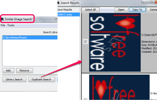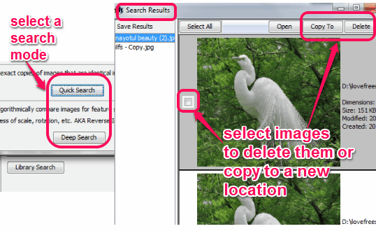 From results window, you can select files that are duplicate/similar and can use Delete button to completely remove them from PC. If you don’t want to delete them, you can shift them to a new location. Thus, organizing the duplicate or similar images is also possible with this freeware.
