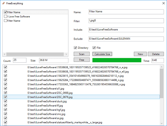 FreeEverything is a free software to bulk delete files, folders via regular expression. The software allows you to create filters to delete files and folder from your hard disk. In the filters that you create, you can specify a regular expression to delete files. Also, you can opt to leave some folders untouched if you want. If you have specified a particular location to delete files then it will delete files from that. And if you don’t specify a target folder to delete files from then it will start looking for files in the entire hard disk and will show them to you. Before deleting files, you can see how much space will be freed up in the hard disk.