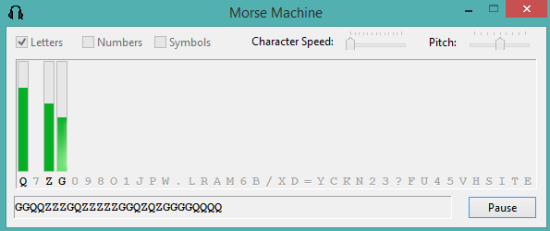 Morse Machine is the last and one of the best software in this list to easily learn Morse code. You can select whether you want to learn only letter, symbols, numbers, or all of them. It also lets you set the Pitch and character speed using its simple interface.