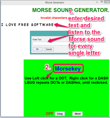 Morsetest is also an interesting software. You can use it to produce and automatically play Morse sound for entered letters or words. You can also add a text file and it will produce sound for every single letter available in that text file. However, it doesn’t show Morse code sequence on its interface, you can only listen to the Morse sound, and see the letters.