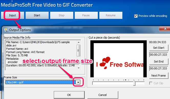 As soon as you will select an input file for conversion, an Output Options window will open up. This window is important to select output frame size and to cut a particular part of video by selecting start and end point for animated gif. You will be able to preview still pictures of input video as well, which is helpful to select the exact part that you want to extract. Frame size for output video can be selected as original file size or you can choose any available preset size (128*96, 352*288, 640*480, 1920*2000. etc.).