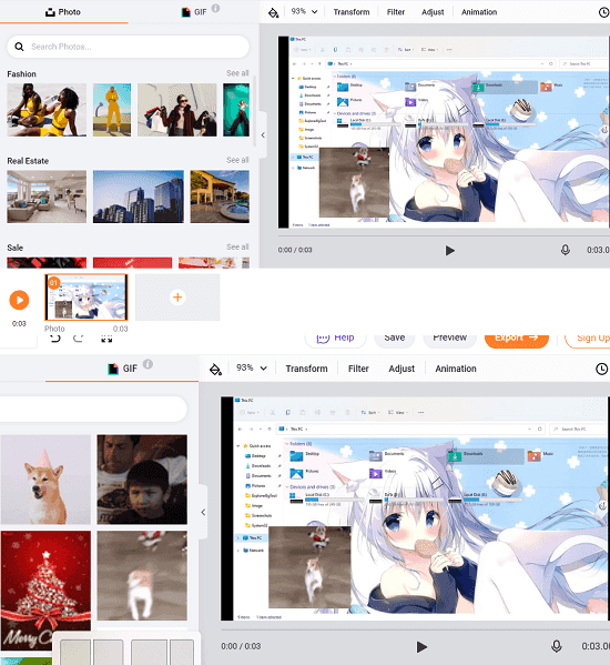 You can create GIFs from existing photos and video clips. You can trim videos before adding them in the final GIF animation along with other elements as well. It also lets you add text to GIF, photo, etc. Also, one good thing is that there are some ready-made templates for the GIF that you can use. All you will have to do is replace the photos in those templates with the ones you want to use.