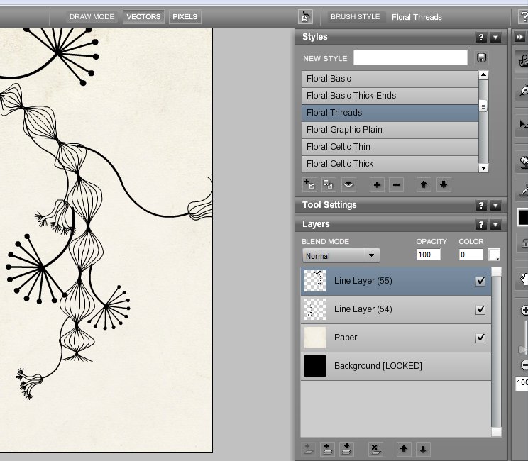 By tweaking various different settings from the sidebar you can achieve various different brush effects. With floral effects you can see flowers “growing” as you are moving through the canvas. This is very useful when it comes to drawing borders. Once again play around with settings to change everything after your own heart. In case of a mistake, simply delete the layer where mistake was made. When you’re ready, click File >> Export to save your work.