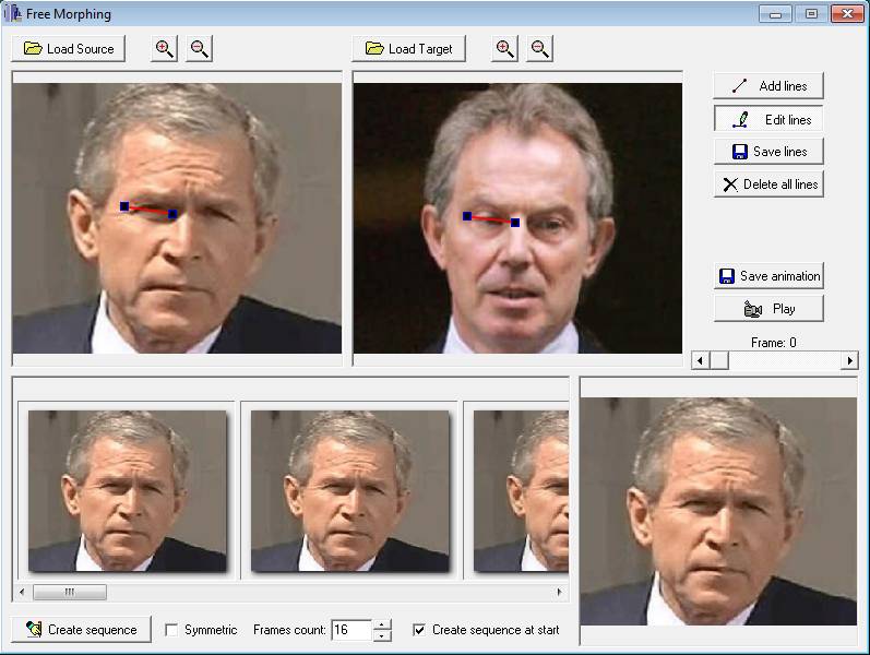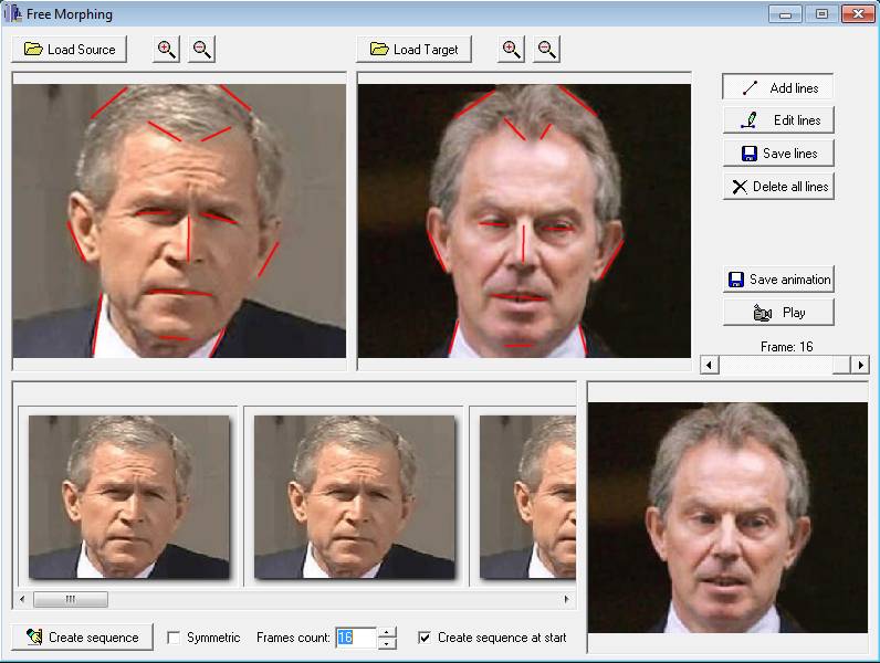 It’s very important that images are of the same size, put as much as the marker lines and use the Add lines or Edit lines options to create new ones or adjust the existing ones. When you’re ready click on create sequence. Click on the Play button and watch a preview of the generated morphing effect. If you’re satisfied save the animation and share it with your friends.