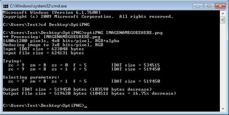 Where of course optipng is the application and the rest is the name of the image with the extension written in. After a few moments, you should receive a report.