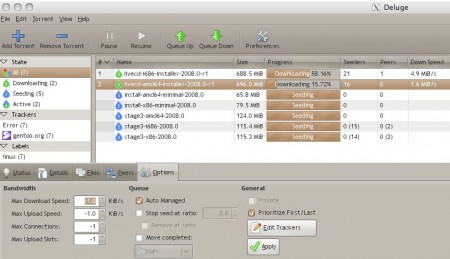 Deluge is a free BitTorrent client that works on Windows, Mac, and Linux. Deluge is designed to work on most of the user environments, and provides multiple user interfaces, including, GTK+, Web, and Console. Deluge is a very lightweight BitTorrent client that makes it extremely easy to download torrents, without consuming lot of system resources.