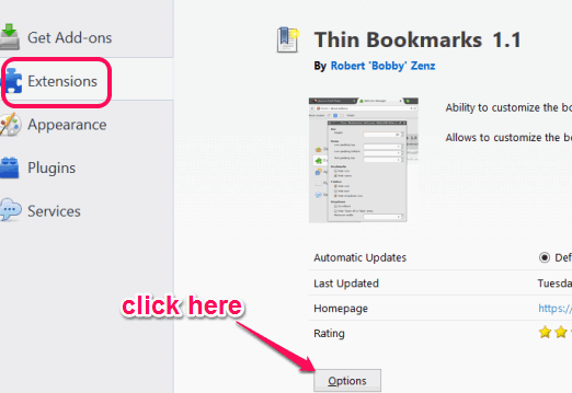 Step 1: Install this add-on using the link given at the end of this review. After this, go to add-ons manager, and access Options window of this Firefox add-on.