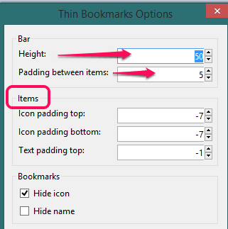 Step 2: In options window, multiple sections are available. Using Bar section, you can set the height of bookmarks bar, and spacing between all the bookmarks and folders present in bookmarks bar.