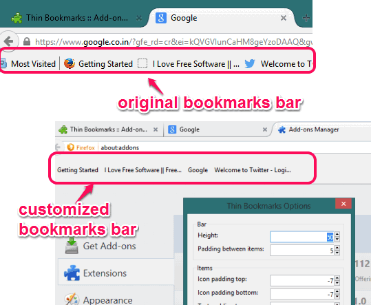 Thin Bookmarks is a handy Firefox add-on that helps to customize bookmarks bar in Firefox. Using this valuable add-on, you can adjust the height of bookmarks bar, spacing between items available in bookmarks bar, hide/display icons of bookmarks, and hide/display names of bookmarks.