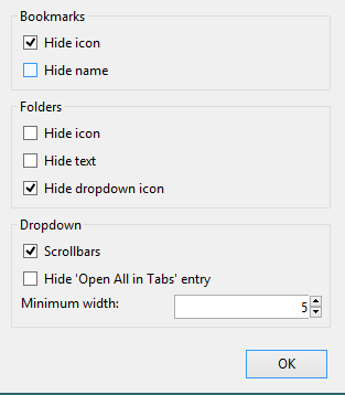 Step 6: This is the last step that lets you set minimum width for drop down pop up that comes for items present in Folders. You can also disable option to open all items in tabs. Once you have set preferences, tap on OK button. Now you will be able to see the changes in Bookmarks bar.