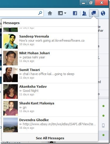 - Messages: This icon shows the recent unread messages and offline chat messages of your Facebook account.