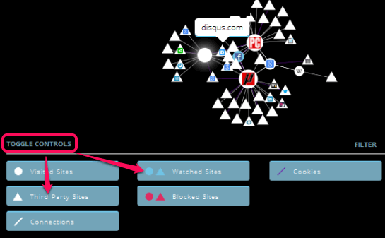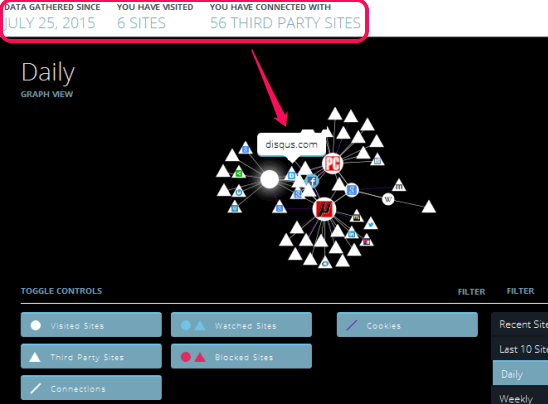 Step 4: Using this step, you can toggle controls like enable/disable Visited Sites, Blocked Sites, Watched Sites, Connections, etc. Changes are reflected in the graph. This gives you a much better idea about websites which use cookies, how they are connected with other sites, and more.
