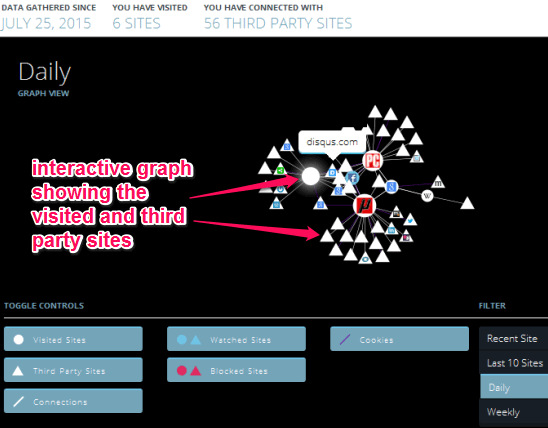 Apart from plotting the graph, it also shows the list of visited and 3rd party sites. Moreover, you can also block any site, turn off tracking, add that particular site to watch list, or hide the website from being visualized.