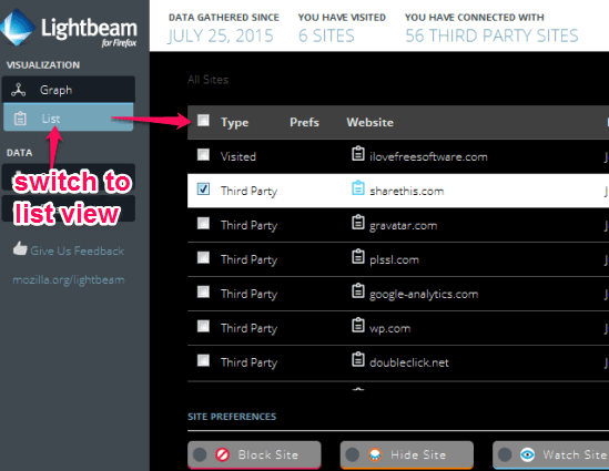 Step 5: When you have to switch from Graph view to List view mode, you can use the left sidebar. After this, you can see the type of website (visited or third-party), first and last access, sites connected with each site, etc. Options to block a website are also available, which will prevent access to your browser for that website.