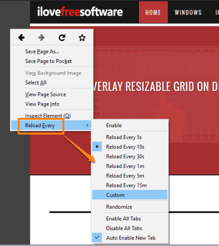 ReloadEvery Firefox add-on is also quite good to auto refresh tabs. It works in the same manner as Tab Auto Reload add-on but has some extra options. You can access pre-defined time intervals or set custom time to refresh any tab using the right-click context menu. You can either right-click on a tab or right-click on a webpage to access its ReloadEvery option, which further contains time intervals for auto refresh. Also, you can enable this add-on for a particular tab or for all tabs.