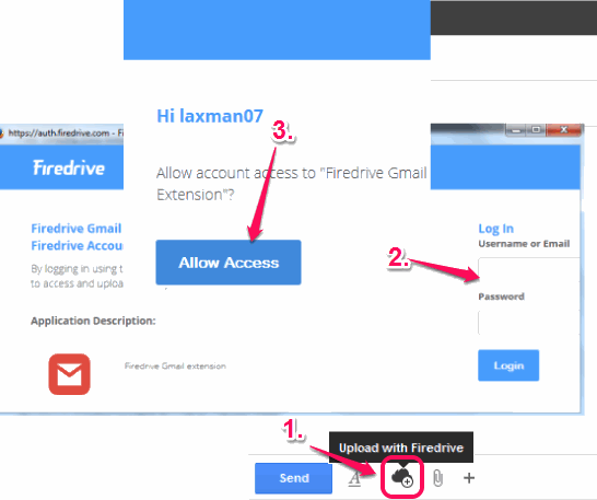 Now open your Gmail account and access compose mail box. You will find Upload with Firedrive icon, just before attach icon. Clicking on this icon will open a new window. It will ask you to login with your Firedrive account and allow access to Firedrive in your Gmail account (one time process only).