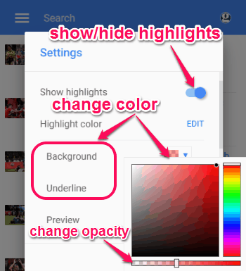 “Player Card” extension allows you to show or hide highlights for the names on a web page. It also lets you change highlight color (background and underline) and its opacity. Simply click on the extension icon and then from the hamburger icon you will be able to customize highlight color and opacity. The following image shows how to change highlight color and its opacity.