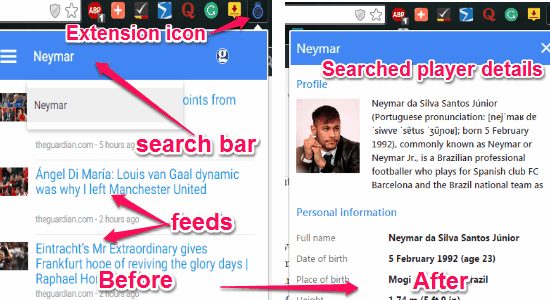 If you want a quick info about any player or league, then instead of browsing through different websites, you can also use the “Player Card” extension icon on the browser toolbar to do so. Simply click on the extension icon and a pop-up window will appear with some football related feeds and a search bar on the top. On the search bar, type name of any player or a league and you will get instant details about that player or league. The following screenshot shows the extension icon and how to get details of a player.