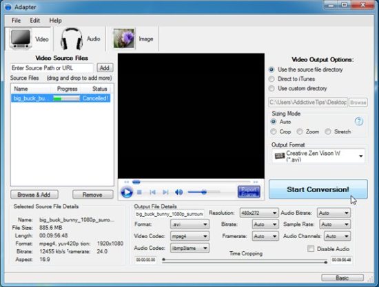 Adapter comes with an easy to use interface for a computer novice but it has also got the power an advanced user wants to see in a video conversion software. If you want to convert your image, audio or video with a specific setting, frame rate or resolution, there are advanced options. Adapter works with these formats: 3g2, 3gp, 4xm, RoQ, ac3, alaw, asf, asf_stream, au, audio_dice, avi, crc, daud, dc1394, s, dv, dv1394, dvd, ea, ffm, film_cpk, flic, flv, gif, h261, h263, h264, idcin, image, image2, image2pipe, imagepipe, ipmovie, m4v, matroska, mjpeg, mmf, mov, mov, mp4, m4a, 3gp, 3g2, mp2, mp3, mp4, mpeg, mpeg1video, mpeg2video, mpegts, mpegvideo, mpjpeg, mulaw, nsv, null, nut, ogg, psp, psxstr, rawvideo, redir, rm, rtp, rtsp, s16be, s16le, s8, sdp, shn, sol, svcd, swf, u16be, u16le, u8, vcd, video4linux, vmd, vob, wav, wc3movie, wsaud, wsvqa, yuv4mpegpipe. This free video converter comes with a preview window where you can see the progress of videos that is being converted in real-time. With it’s built in video playback feature, you can see what your video files will look like after and before converting.
