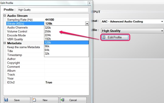 Free Audio Converter 4dots comes with preset output profiles (highest quality, high quality, medium quality etc.) which you can select accordingly. Apart from this, you can even edit any profile, can select bitrate, sample rate, VBR quality, audio channels, and can save the profile.