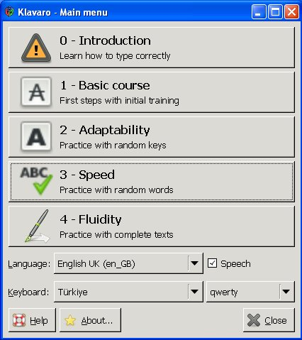 Klavaro Touch Typing Tutor comes with a simple interface comprising of a main menu that points to lessons that teaches you typing in a step by step way. Lets’s have a look on them.