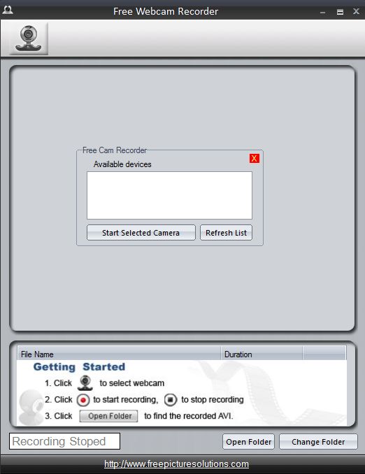 First thing that you’re gonna see after running Free Webcam Recorder is the web camera selection pop-up. This is where you can select which webcam, if you have several of them attached, default one is gonna be used. This is useful for people who have integrated cameras in their notebooks, but would like to use an external webcam, for example.