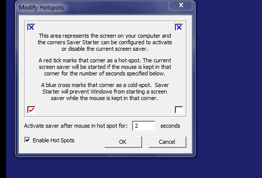 After Installation you can select modify hotspot in the Saver Starter. This is also very simple to do. All you have to do is move your cursor over the Saver Starter Icon and then Right click on it and select Modify hot spots. Below I have explained the Modify Hot spots feature of the Saver Starter where you will have the following settings.