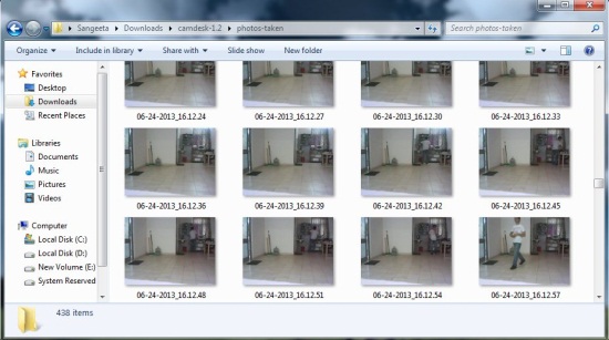 CamDesk will silently monitor your home or office using your webcam and saves a series of photos taken in continuation from the webcam feed for your reference. CamDesk names these photos using the date and time during which they are captured, so that you will be able to know the time duration of the suspected activity. The photos are saved in a folder named “photos-taken”, which can be found inside the CamDesk folder.