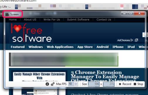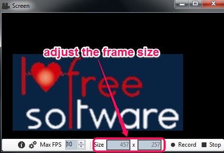 You can immediately start the recording, can pause anytime, and can stop recording using Record and Stop button. But you can even customize few settings, like adjust the frame size and Max FPS (higher the FPS, more will be the output size). Enter the details according to requirement and start the recording.