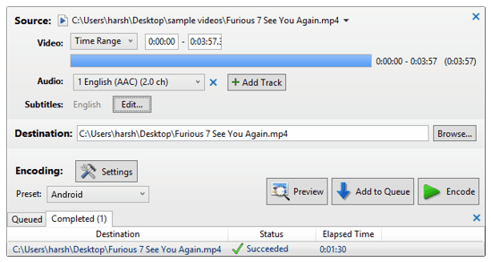 Start by selecting the video file on the top. Click on ‘Edit’ next to ‘Subtitles’ and choose the subtitle you want to hardcode. Make sure you select ‘Burn-In’ while adding the subtitle to hardcode. On the main interface, click on ‘Add to Queue’ and make sure you select a video preset. Finally, click on Encode to hardcode the subtitle the video.