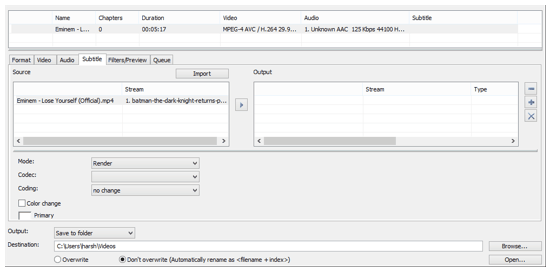 Xmedia Recode is a free software that allows you to convert videos to other extensions. It also possesses an audio converter as well as a video editor. Here, we are going to use it to harcode subtitles on a video. The process is really easy. You have to load a video file or disk from the toolbar above. When you can see it in the list, select it and further choose the ‘Subtitle’ tab. Click on ‘Import’ to select the subtitle file. Make sure the ‘Mode’ is selected at ‘Render’.