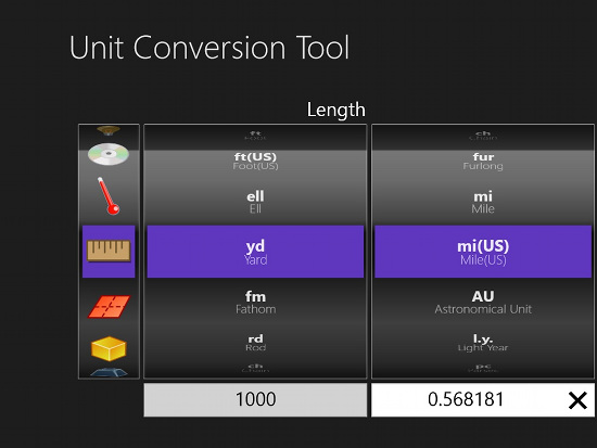 I really like the way the interface is laid out. When I opened up the app for the first time; it was a little confusing because instead of text there are icons which related to the appropriate conversion. But once you start to use this free unit converter for Windows 8, the interface starts to feel more and more natural and easy to use.