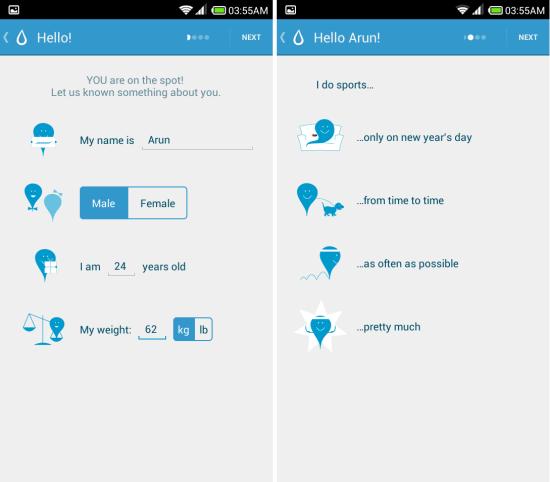 Now Hydro Coach for Android will ask you certain basic information about yourself. This includes name, gender, age, and weight; once you filled this up, press on the next button located on the upper right corner of the app window. After the above, you will now need to select the level of sports you do.