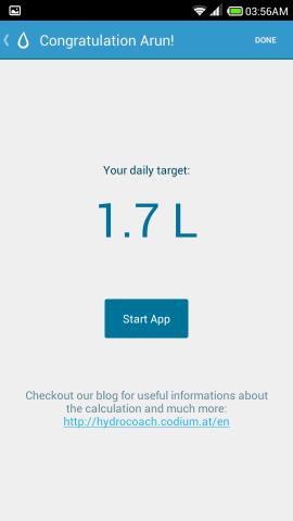 After Hydro Coach for Android has collected all the information it needs, it will present you with your daily calculated target according to the data which you just put in.