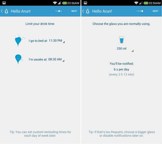Next thing that the app needs is the time when you go to sleep and the time at which you wake up. After clicking on the next button you will need to enter the size of the glass which you are using to drink water.