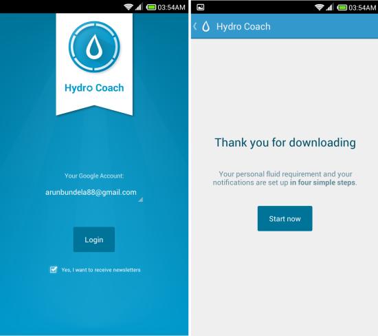 You can get this app from the link or QR code provided at the very end of this article. Once installed, simply launch it and Hydro Coach will ask you to login to the app using a Google account. Once logged in, you will have the interface as seen here and then to start with the app, press the ‘start now’ button as seen below.