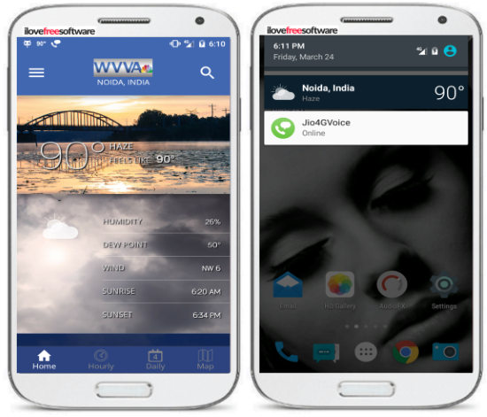 WVVA Weather is another Android weather app to display temperature in status bar of your phone. It displays temperature in the status bar as soon as you open this app for the first time. It automatically detects your location and fetches weather info from WVVA to show you the current temperature of your area in the Android status bar. By default, this app shows the temperature in Fahrenheit unit, which you can change to celsius in app preferences. What makes it more useful, from other weather apps on my list is that it can show an alert for severe weather conditions like lighting, precipitation, etc. Another exciting feature is that you can add multiple locations and see their weather updates within the app. It is a pretty useful app for weather freaks as they can know the hourly weather updates of a day and future predictions of up to 7 days from its dashboard. If for some reasons it doesn’t display any temperature in the status bar, then make sure that its “Temperature Display” option is enabled.