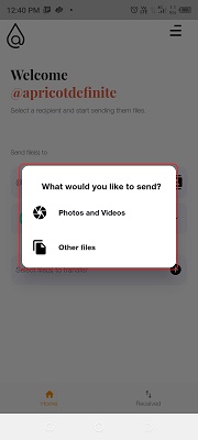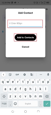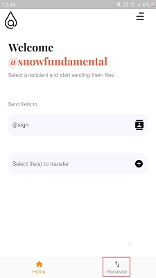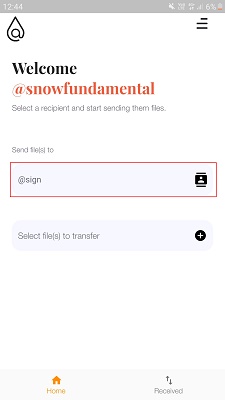 6. This brings up the Home screen to start the file transfer. Tap the @sign field, tap on the ‘+’ sign and add the @sign of the intended recipient to save it as a contact.
