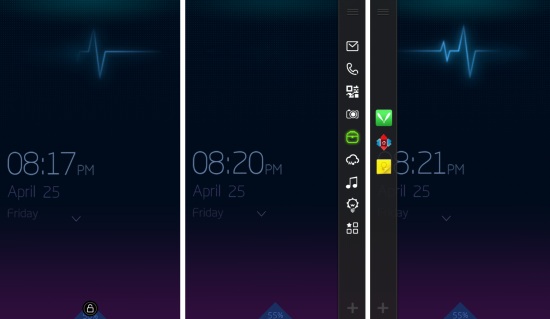 The default lock screen of the app shows a heartbeat animation on the top. By sliding the time down, the screen will be unlocked. Also swiping from the right edge gets you some commonly used apps as seen here, while swiping from the left edge gets a list of apps which you can customize. Using these sidebars you can launch the commonly used apps really quickly. In different themes in Locker Magic for Android you have different and sometimes unique methods for unlocking along with cool animations and functions.