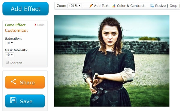 When you upload the photo, click on the “Add Effect” button on the top left corner. Then scroll down on the page and select “Lomo Effect”. As soon as you do that, the effect will be applied to the photo. You can customize the effect by changing the saturation, mask intensity, brightness, contrast, etc. When you’re all set, you can save and share the resulting photo with ease.