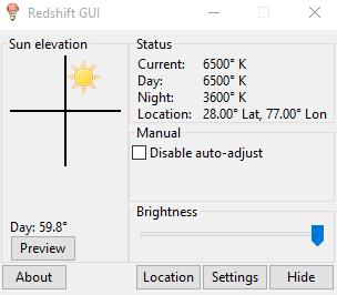 The brightness can only be manually set. However, to start using RedShiftGUI, you have to enter the latitude and longitude manually in the Location menu. Changes to transition speed can be made in the settings. This application has to be manually added to startup. Right-clicking its system tray icon turns off the automatic temperature adjust settings.